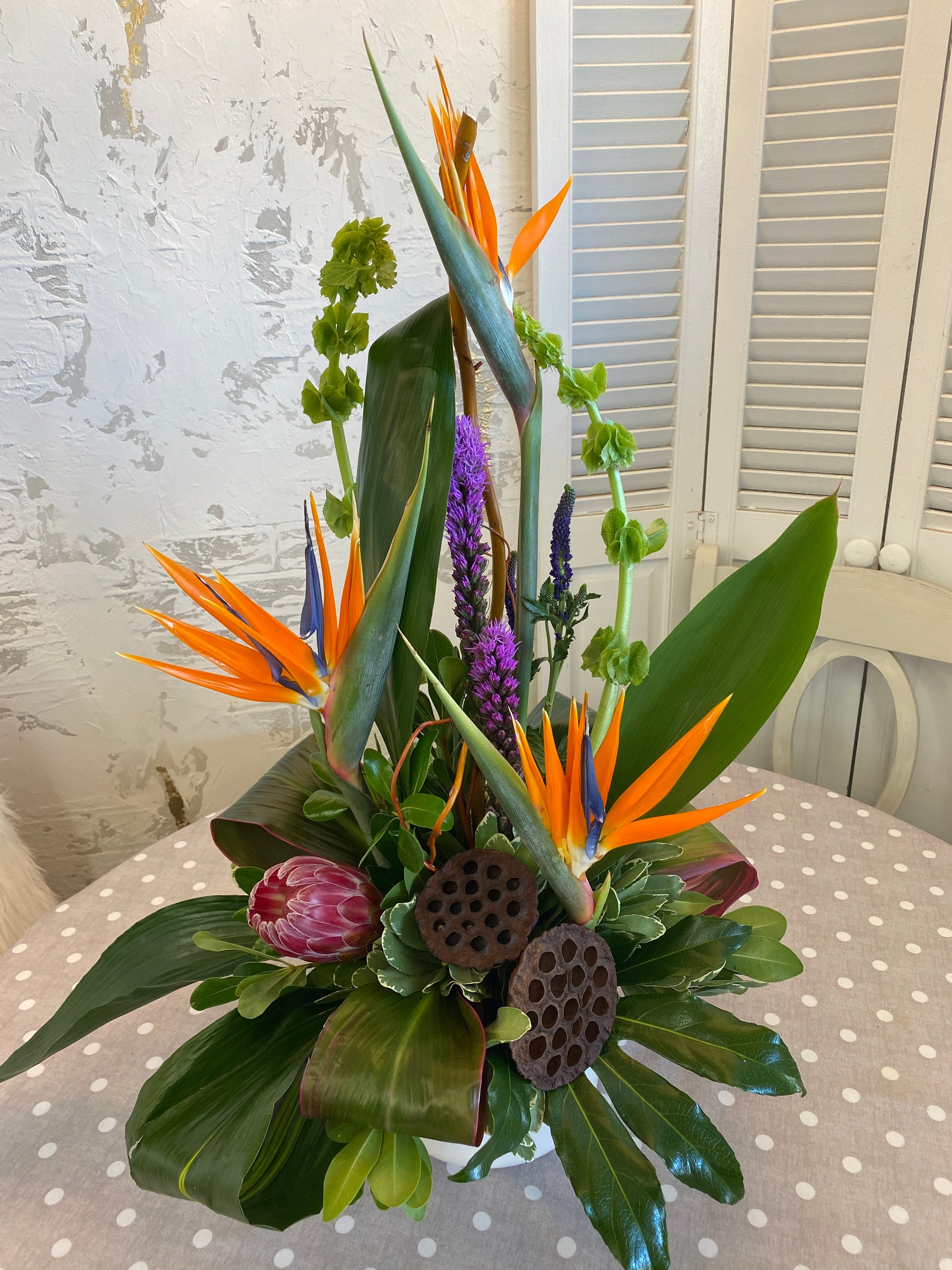 Birds of paradise are the star of this large arrangement and are accented with Fresh greens, bells of Ireland, a protea and lotus pods.
