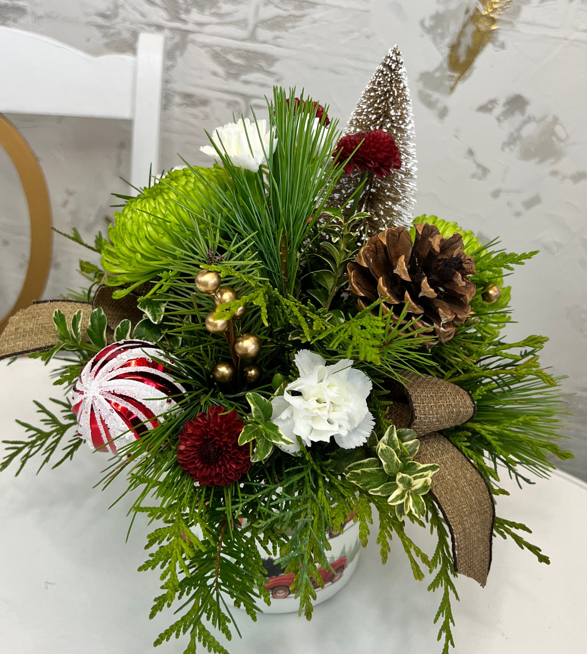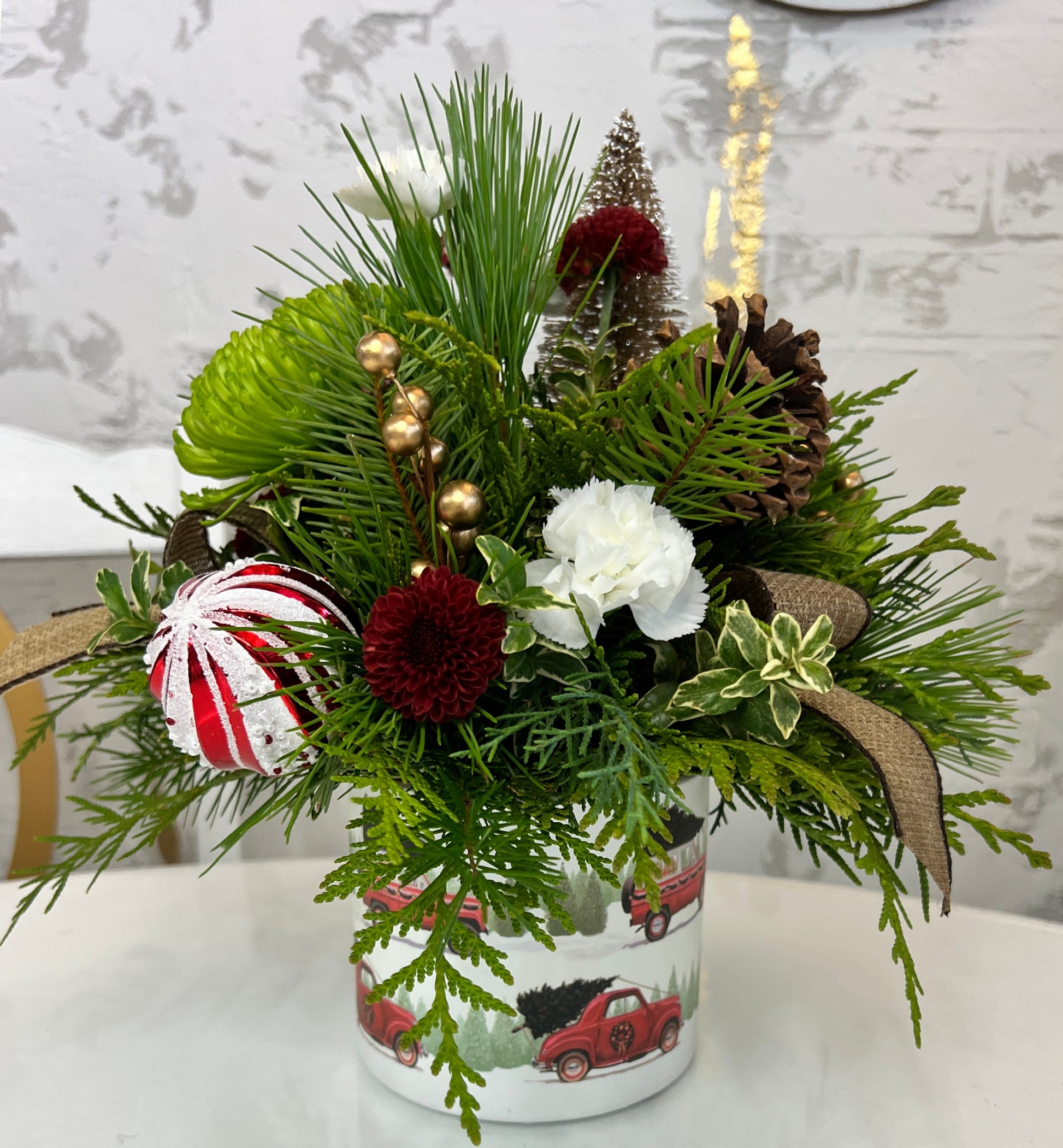 Wintery greens, fluffy mums and mini carnations are super adorable with a mini tree in a pot covered with little red trucks. This arrangement would look great in th eliving room or on the kitchen island!
