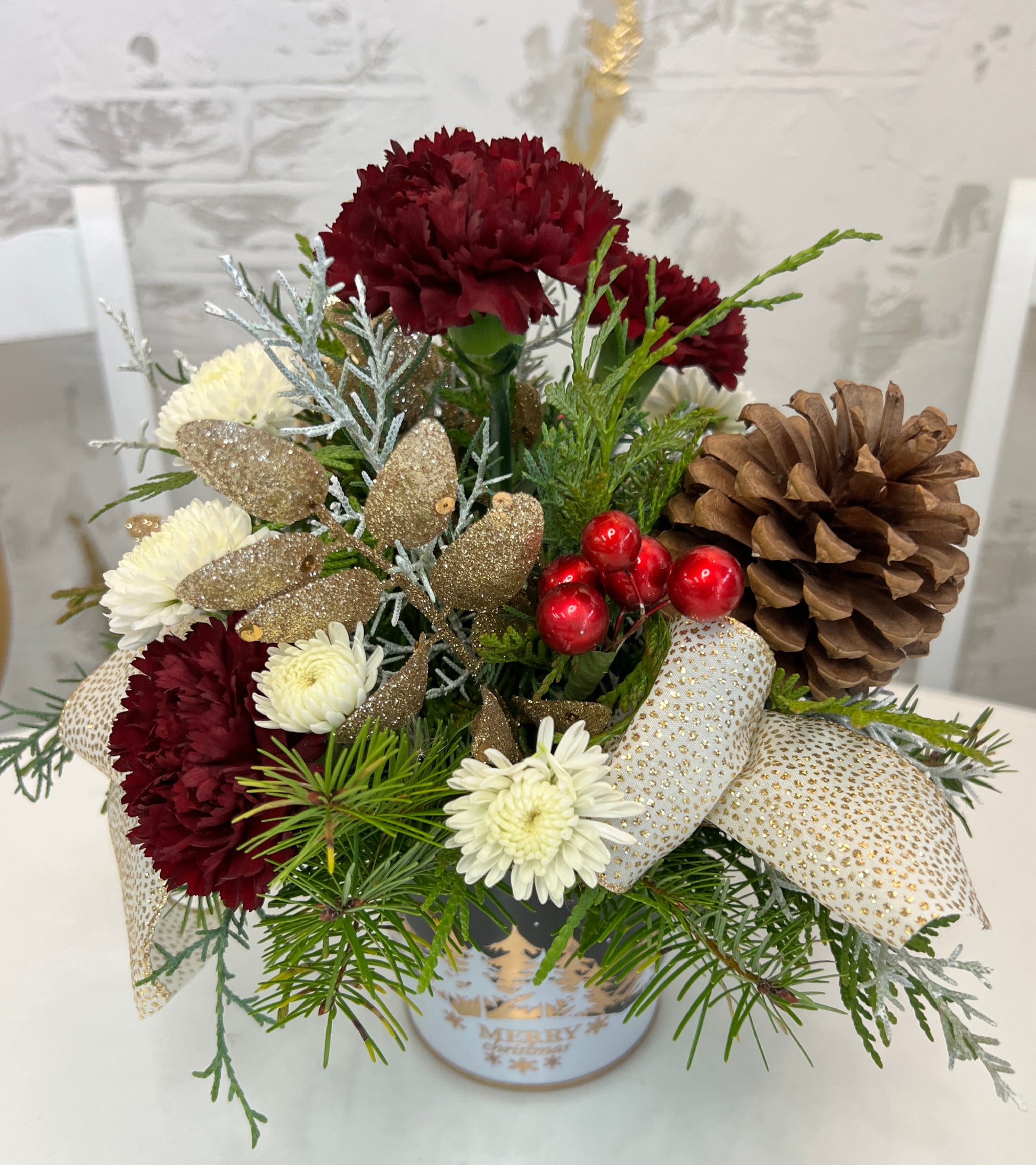 Carnations and mini mums paired with crisp winter greens and fun holiday sparkle. This arrangement is perfectly petite and would be lovely on a small side table or in a small suite.